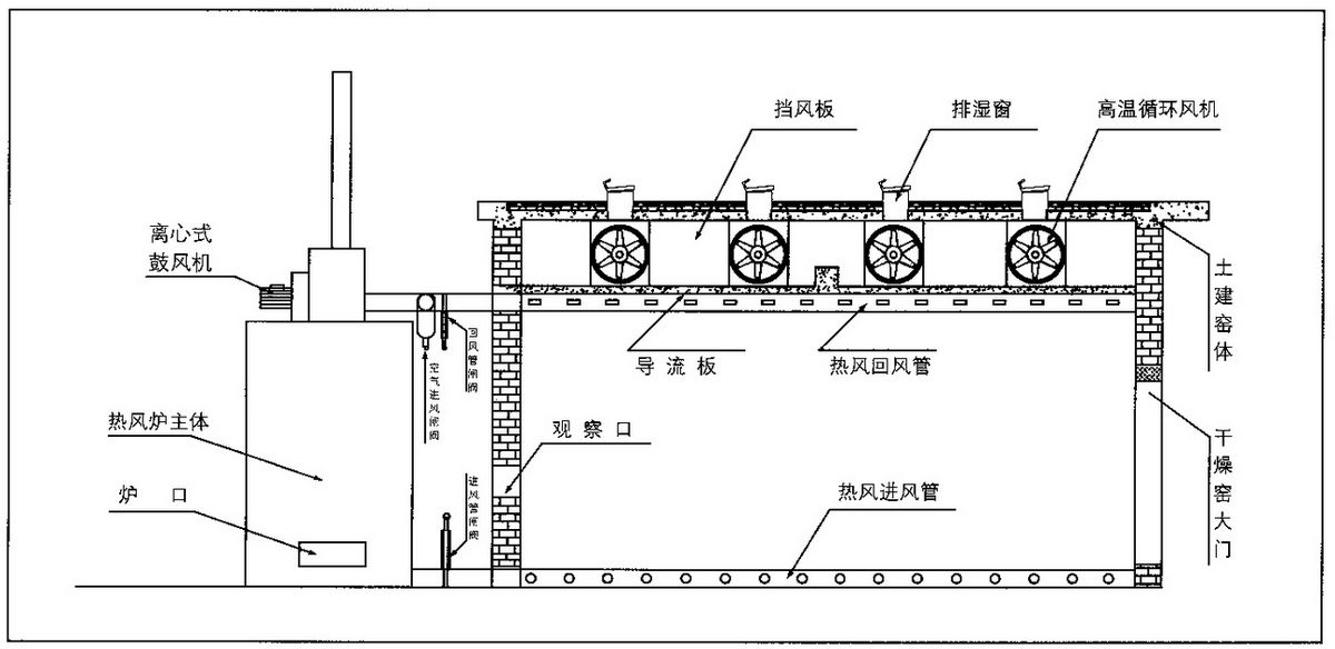 熱風(fēng)式干燥設(shè)備工作原理是利用燃燒產(chǎn)生的熱能,加熱窯內(nèi)的空氣,由熱風(fēng)爐頂部主風(fēng)機(jī)將窯內(nèi)的空氣通過管道吸入爐體,將空氣加熱。再通過管道,送入窯內(nèi),由窯內(nèi)的循環(huán)風(fēng)機(jī)不斷的循環(huán)對(duì)窯內(nèi)的木材均勻加熱。木材干燥過程中如需要蒸汽,可由熱風(fēng)爐內(nèi)的蒸汽發(fā)生器提供,如果是一爐兩房或多房時(shí),管道上裝有插閥,通過插閥的調(diào)節(jié)來控制窯內(nèi)的溫度。在干燥的過程中,由于木材要進(jìn)行排濕,在窯頂上留有排濕孔(根據(jù)地區(qū)而定)和裝有抽濕機(jī),用來調(diào)節(jié)排濕的快慢.